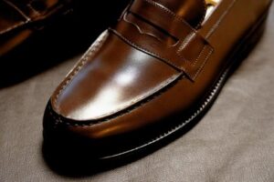 このサドルには細い切れ込みがあり、そこに 1セント硬貨(penny)を差し込む習慣があったため、penny loafer(ペニーローファー)と呼ばれるようになりました。
