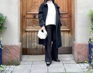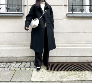 黒、ネイビー、チャコールグレーなどの落ち着いた色のコートであれば、4個ボタンでも自然に見えます。
